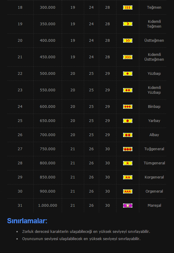 - Oyuncunun seviyesi ulaşılabilecek en yüksek seviyeyi sınırlayabilir.